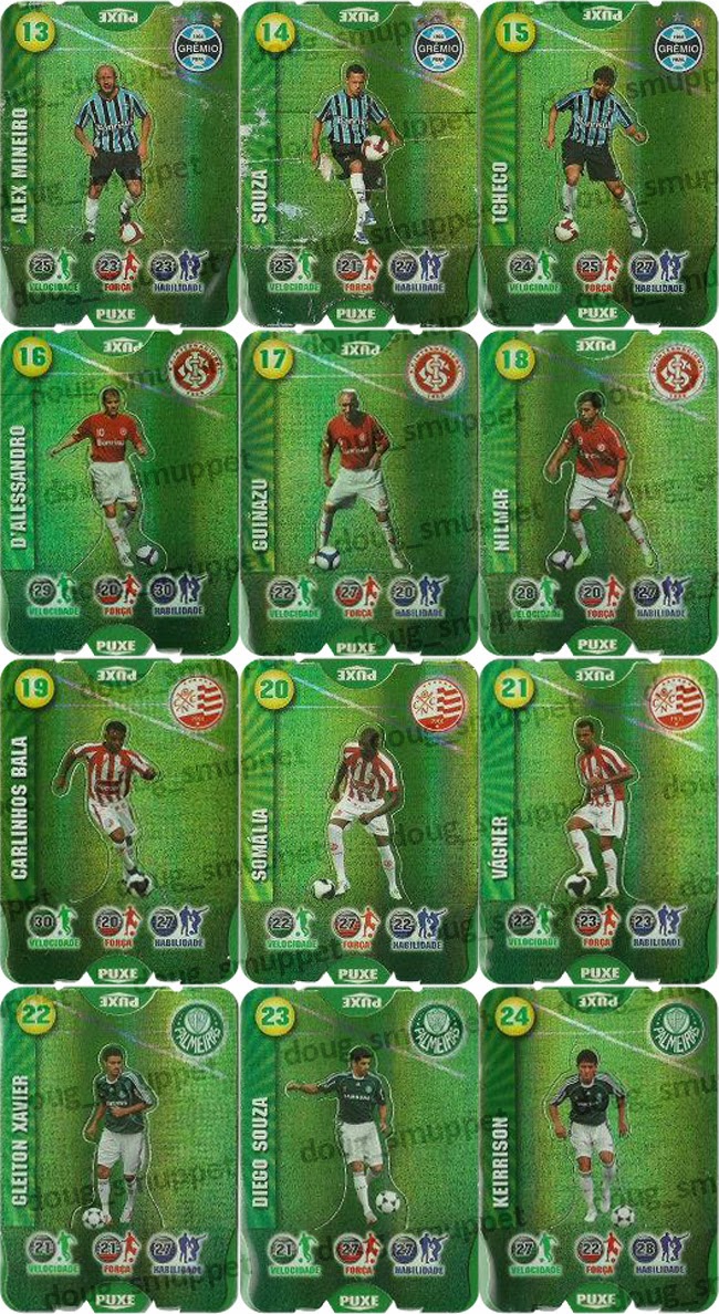 Botafogo, Vasco, Grêmio, Internacional, Cruzeiro, Sport, Náutico. O legal destes cards é que eles são dobráveis e o jogador se destaca ficando em pé. Eles tem poderes como: velocidade, força e habilidade.